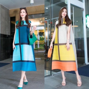 فستان نسائي طويل بطيات من Miyake, فستان نسائي صيفي به ثنيات من Miyake ، فستان منقوش بلون كبير بدون أكمام ، فستان طويل للشاطئ موضة 2022