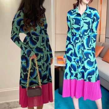 ชุดเดรสยาวคลุมเข่าพิมพ์ลาย Miyake ของผู้หญิงใหม่ฤดูใบไม้ร่วง